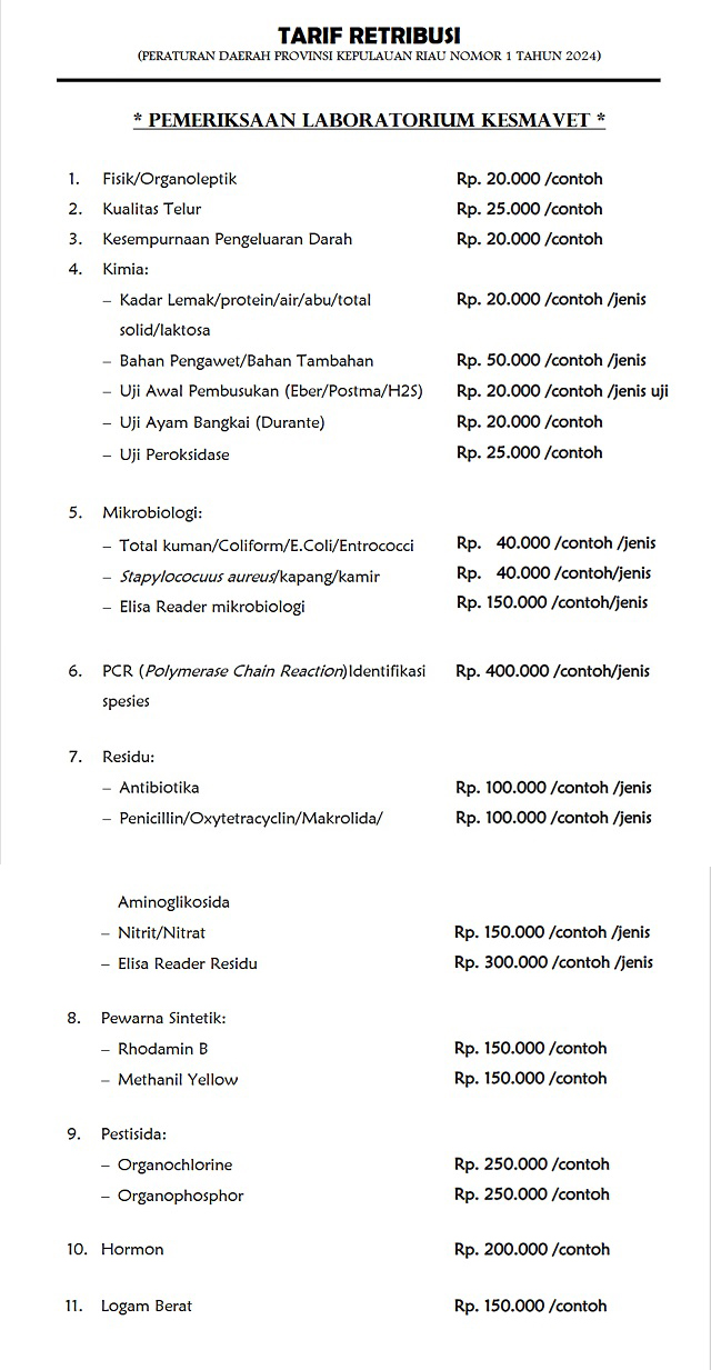 Menu Utama HomeKepalaSub Bagian Tata UsahaSeksi Pelayanan Kesehatan HewanSeksi Pelayanan LaboratoriumSOTKGalleryRetribusi KlinikRetribusi Labor KesmavetRetribusi Labor Kesehatan Hewan Jam Pelayanan Senin - Jum'at: 09:00AM - 15:00PM Sabtu & Minggu: Libur Hits 2071 Total Pengunjung 910