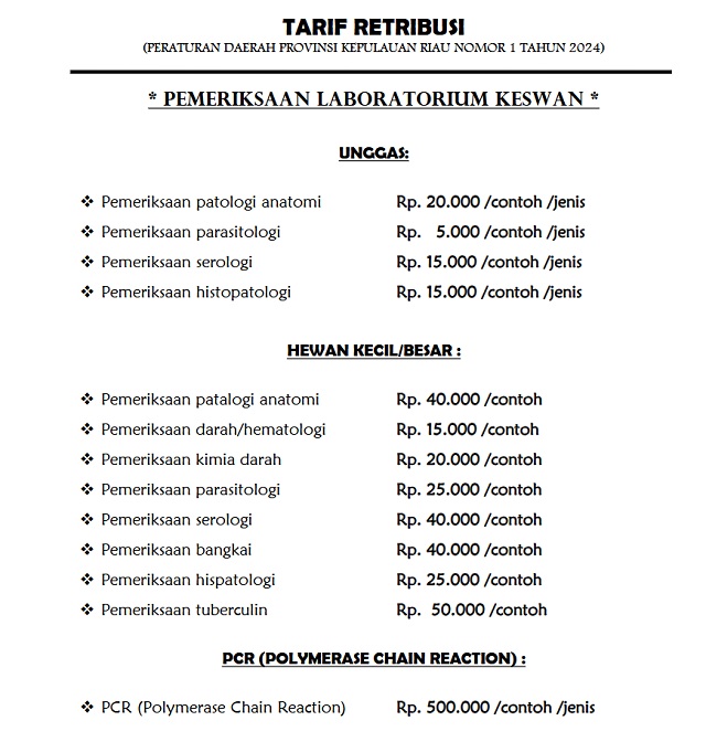 Menu Utama HomeKepalaSub Bagian Tata UsahaSeksi Pelayanan Kesehatan HewanSeksi Pelayanan LaboratoriumSOTKGalleryRetribusi KlinikRetribusi Labor KesmavetRetribusi Labor Kesehatan Hewan Jam Pelayanan Senin - Jum'at: 09:00AM - 15:00PM Sabtu & Minggu: Libur Hits 2070 Total Pengunjung 910